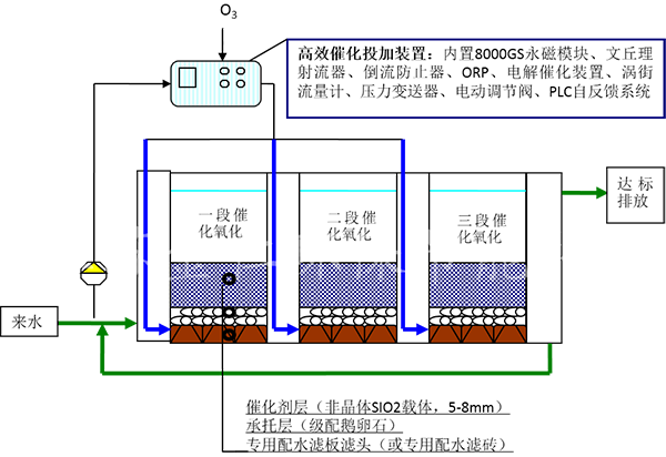 通過高效催化投加裝置后的臭氧和水的混合液,由增效噴嘴進入專業設計的氣水分配濾磚均勻進入貴重金屬的催化劑層,催化劑表面具有外墻電位,有效的激發產生羥基自由基,羥基自有基的氧化還原電位為E0=2.8ev,在如此高的氧化電位的作用下大部分難降解的有機物發生斷鏈反應形成短鏈的有機物或直接被氧化至CO2和H2O,最終出水可達設計排放標準。永磁高級催化氧化系統的工藝流程如下所示: